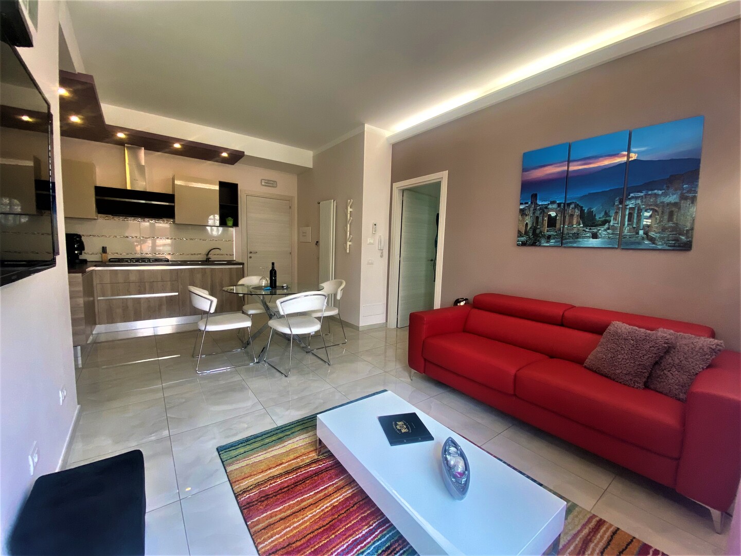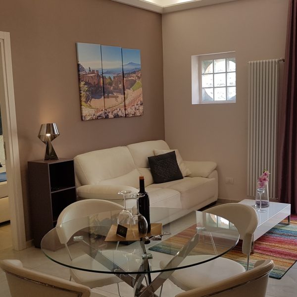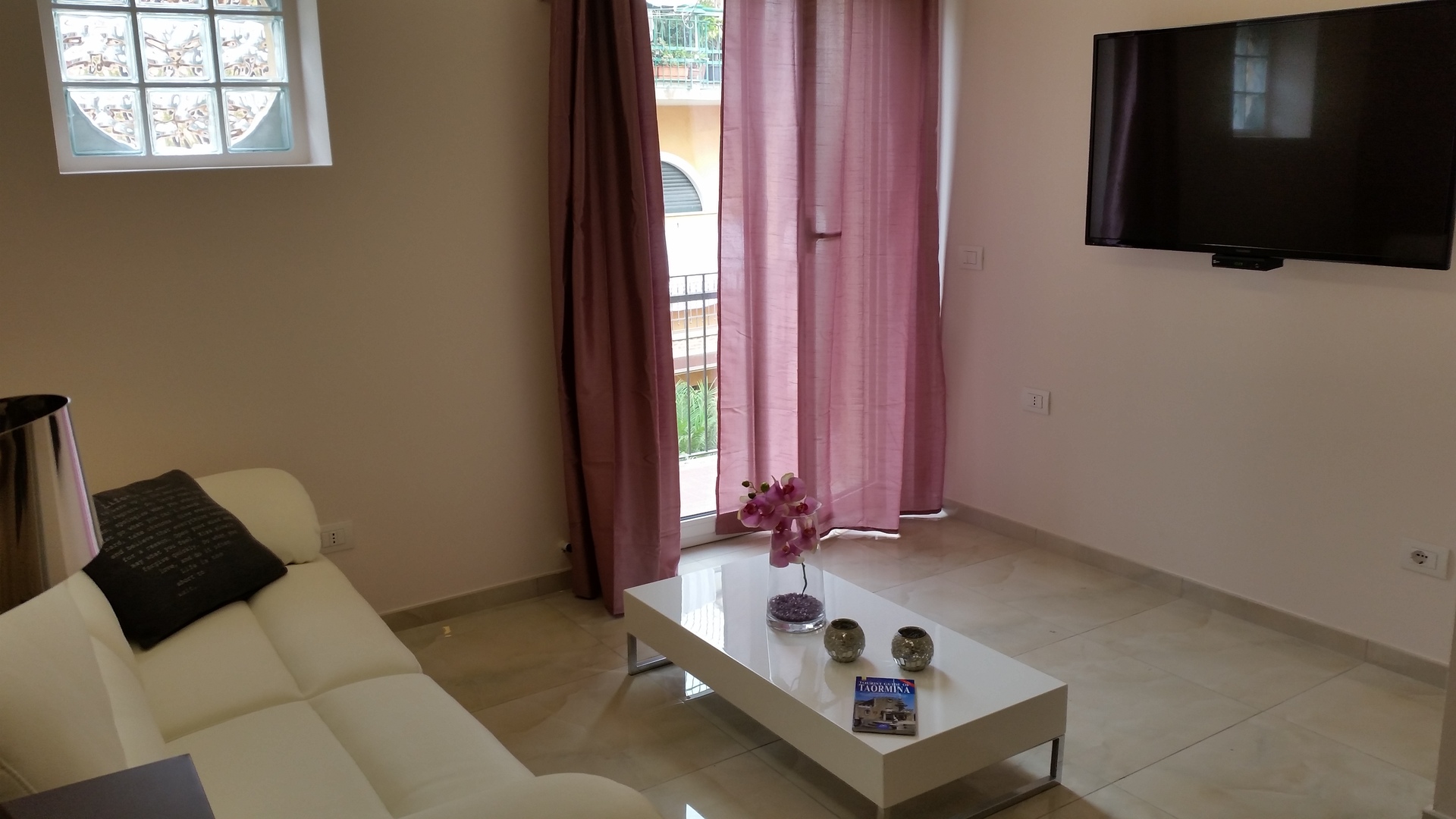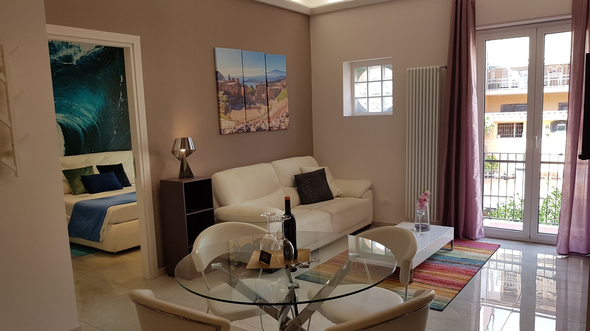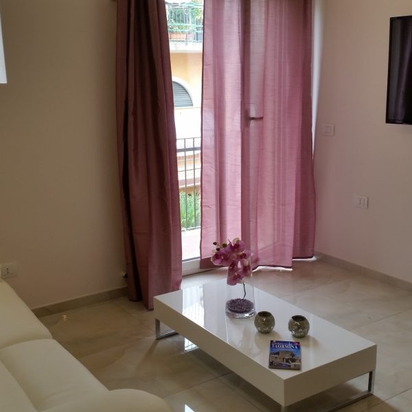 L'appartamento, situato al 2º piano di un edificio nel centro storico di Taormina (a pochi passi da Porta Messina), dispone di due camere matrimoniali, un bagno con doccia, una cucina-soggiorno e un balcone.