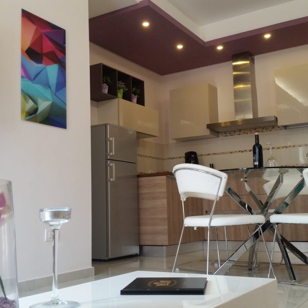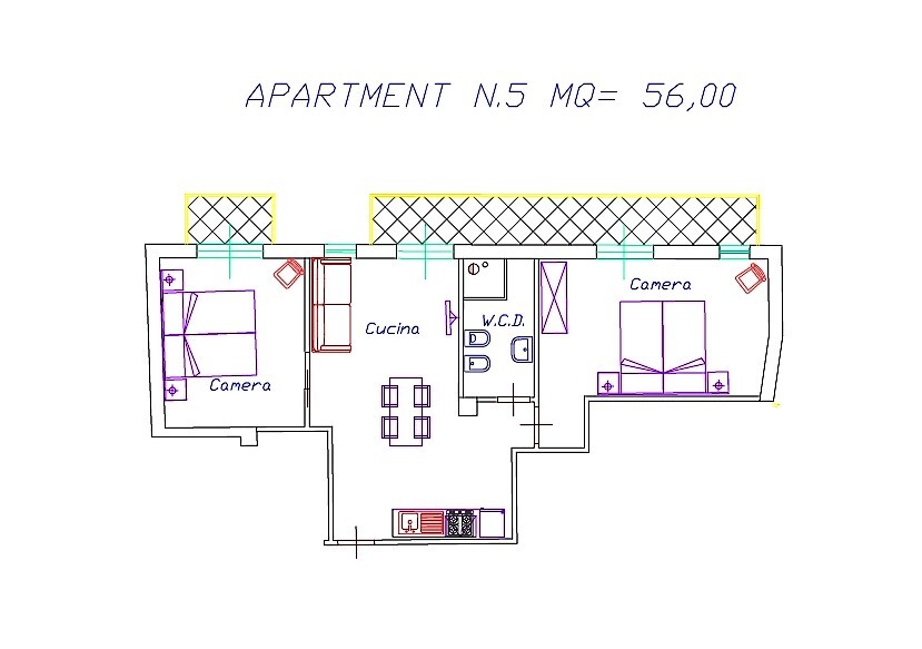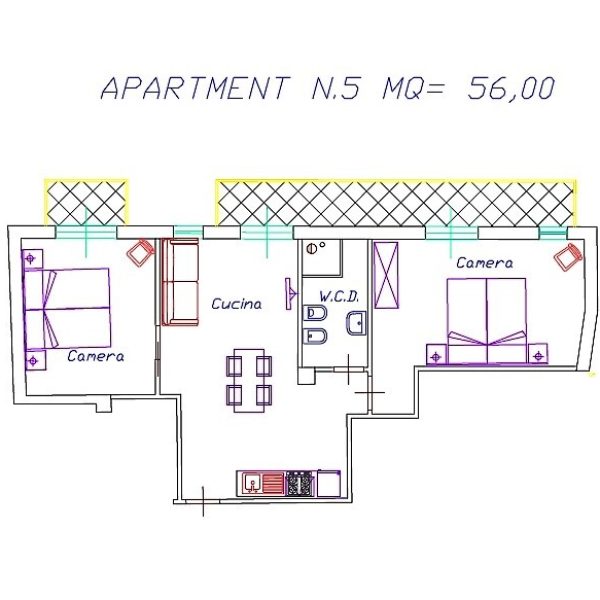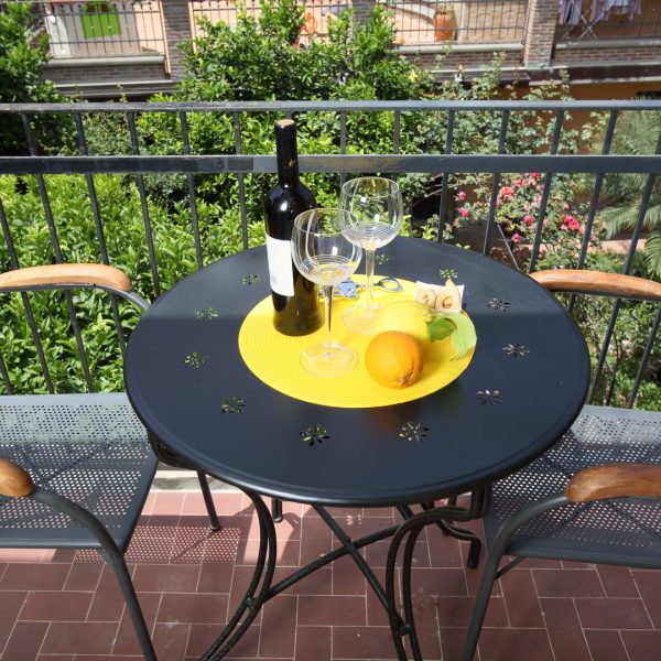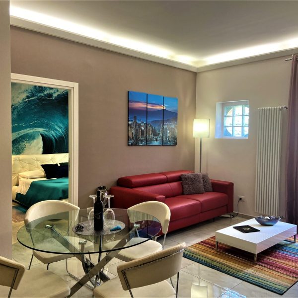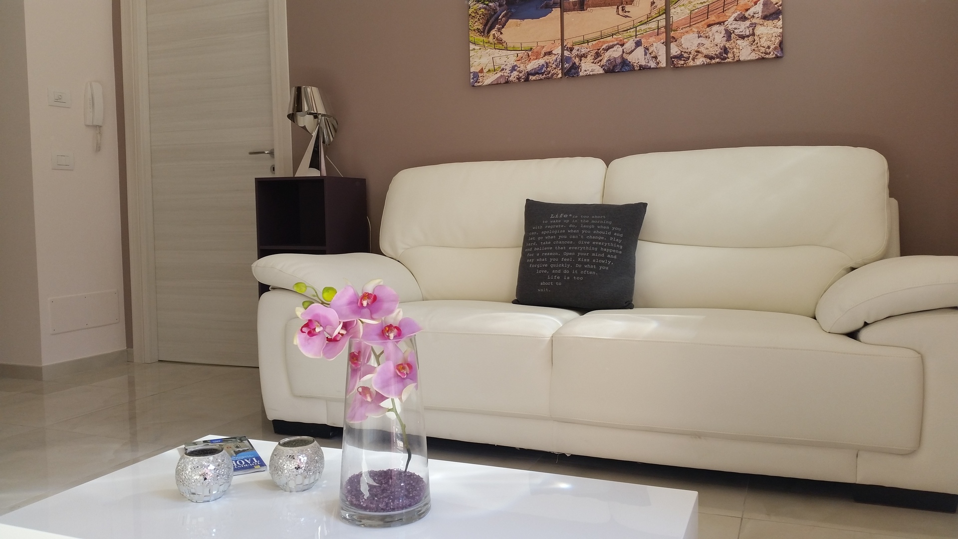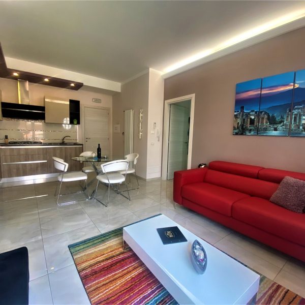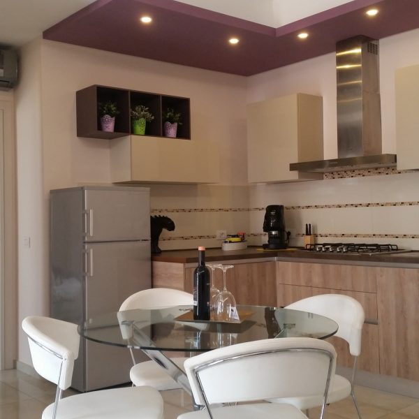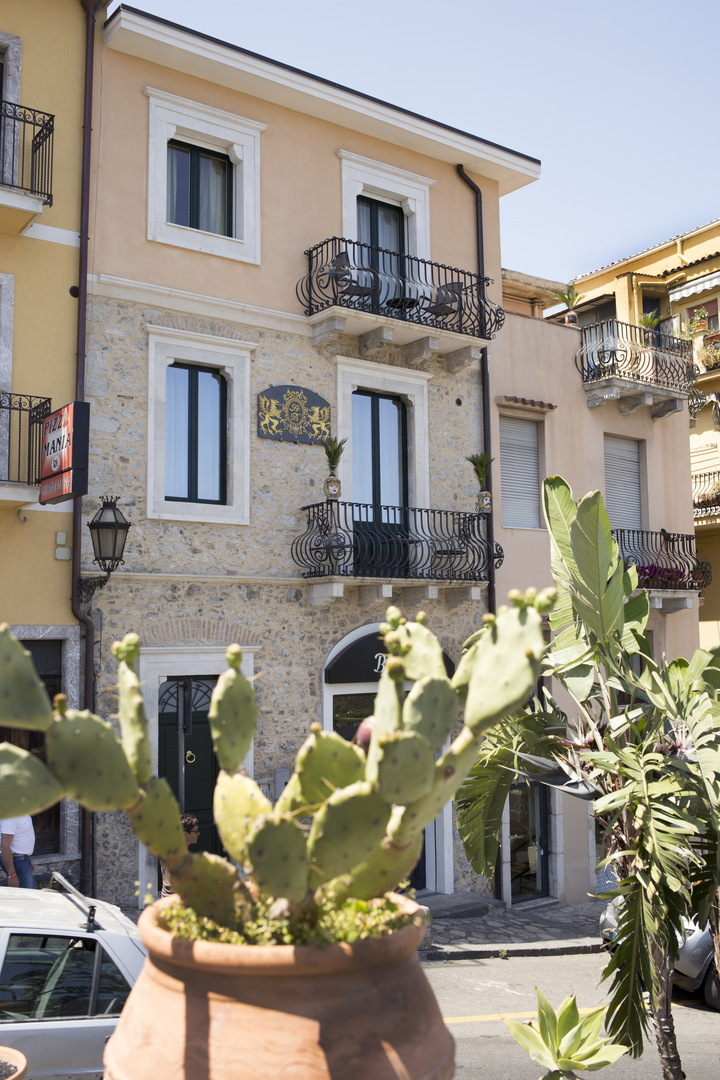 L'appartamento, situato al 2º piano di un edificio nel centro storico di Taormina (a pochi passi da Porta Messina), dispone di due camere matrimoniali, un bagno con doccia, una cucina-soggiorno e un balcone.