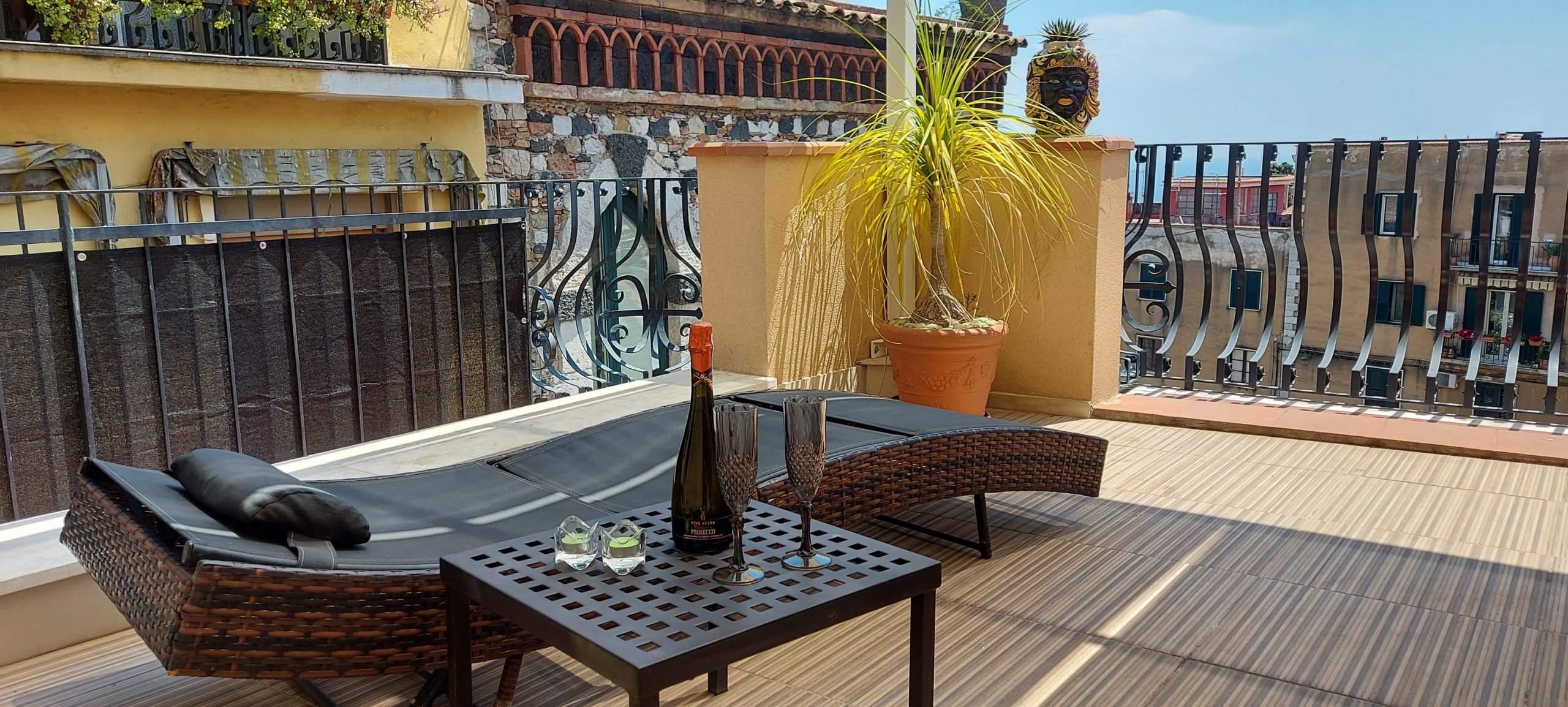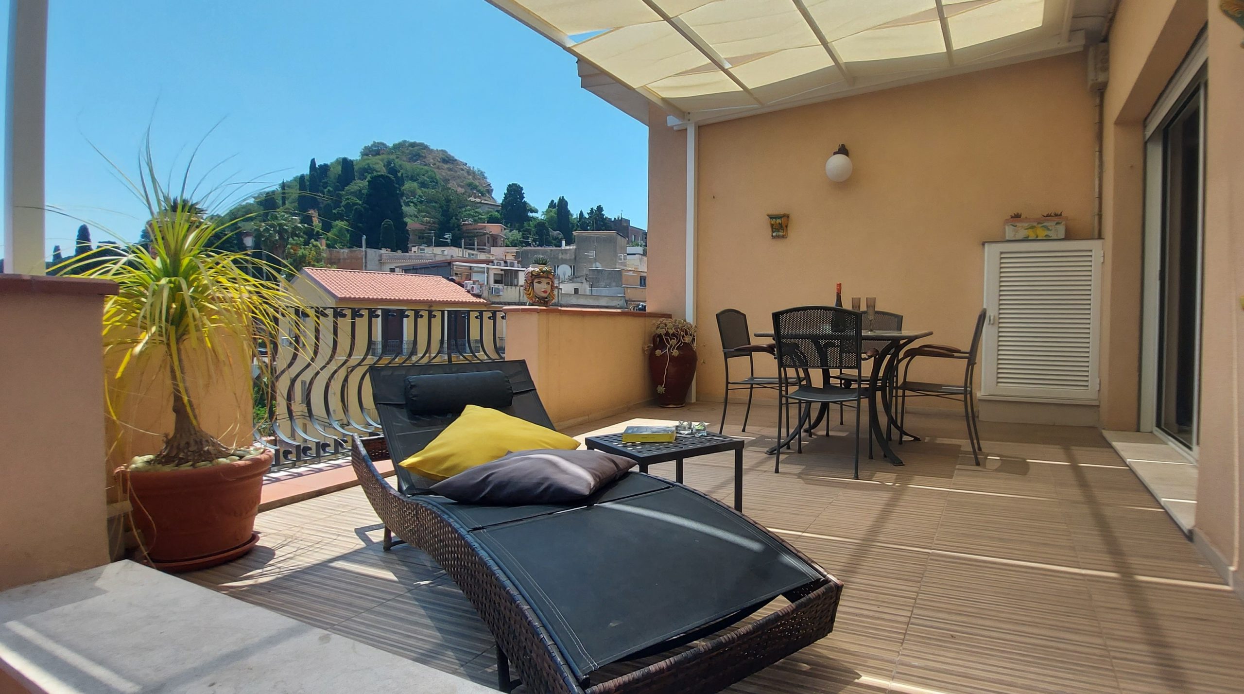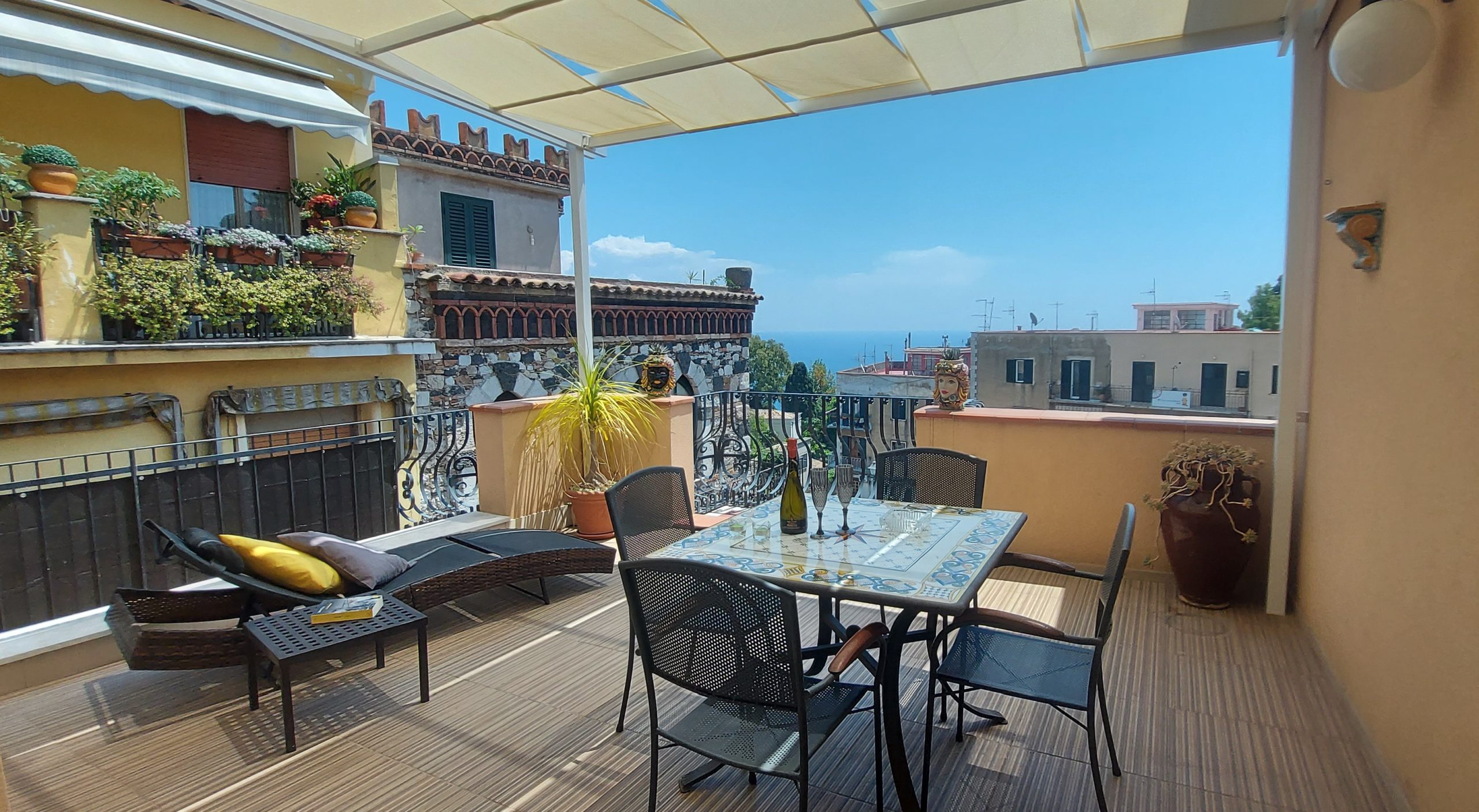 L'appartamento, situato al 2º piano di un edificio nel centro storico di Taormina (a pochi passi da Porta Messina), è nuovo e dispone di una camera matrimoniale, un bagno con doccia, una cucina-soggiorno (con divano letto matrimoniale) e una terrazza sul tetto.
