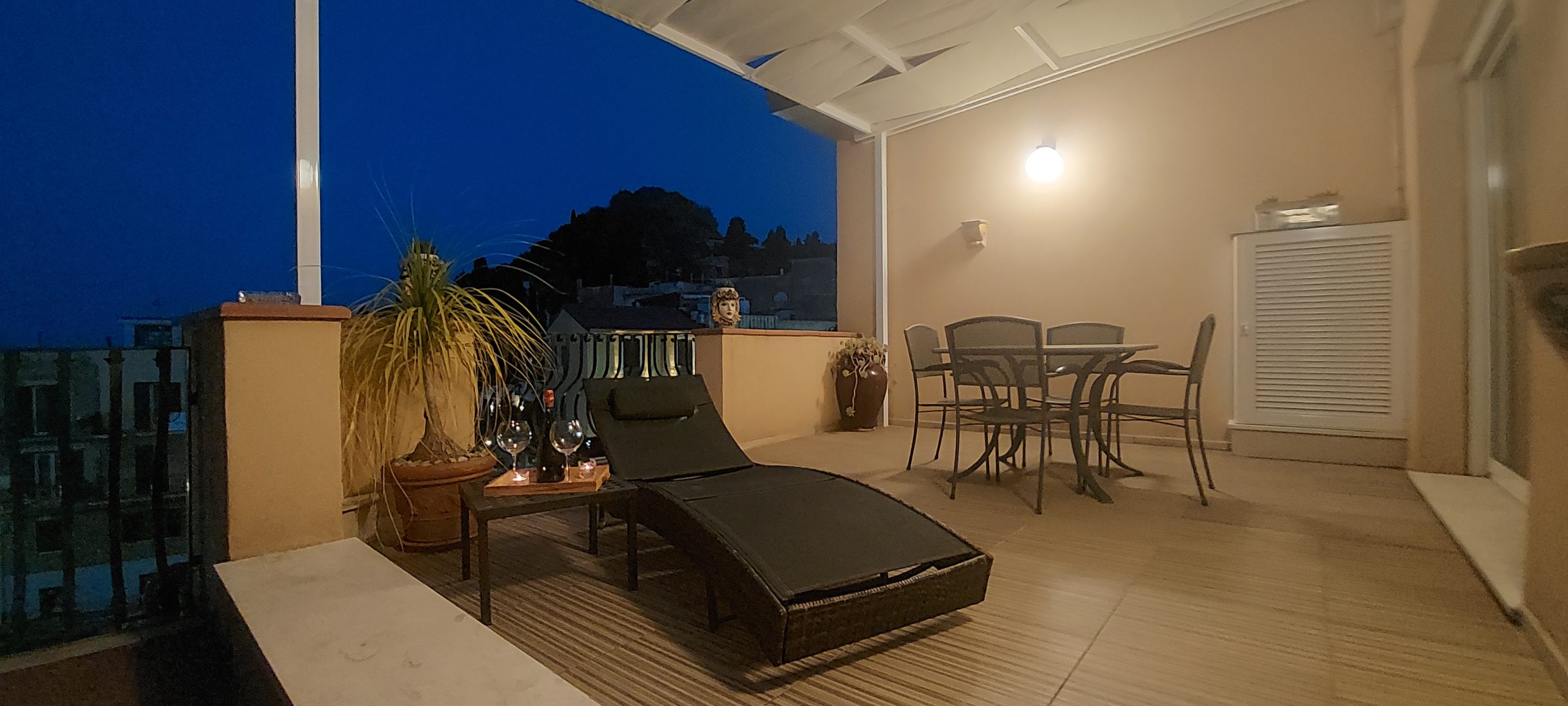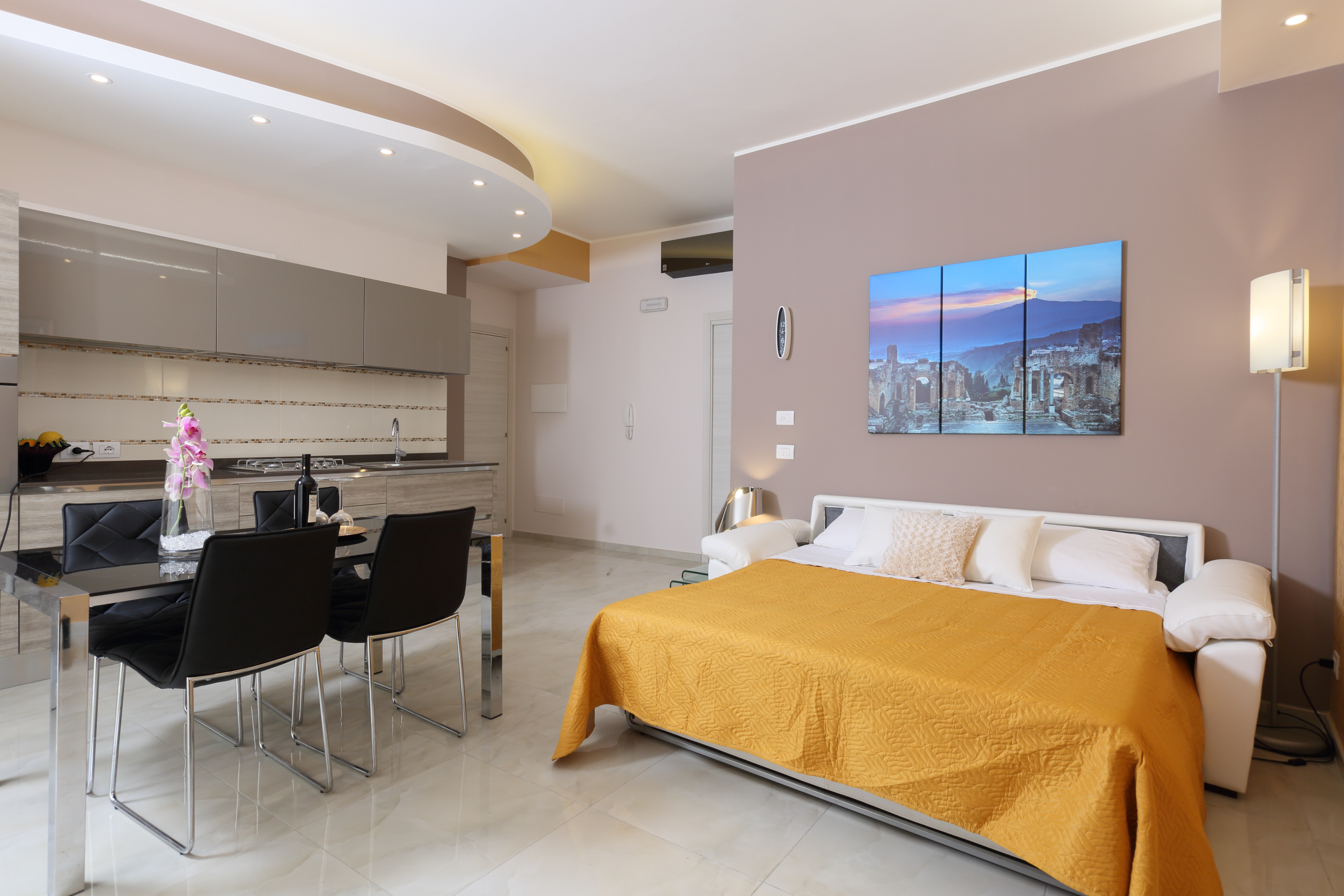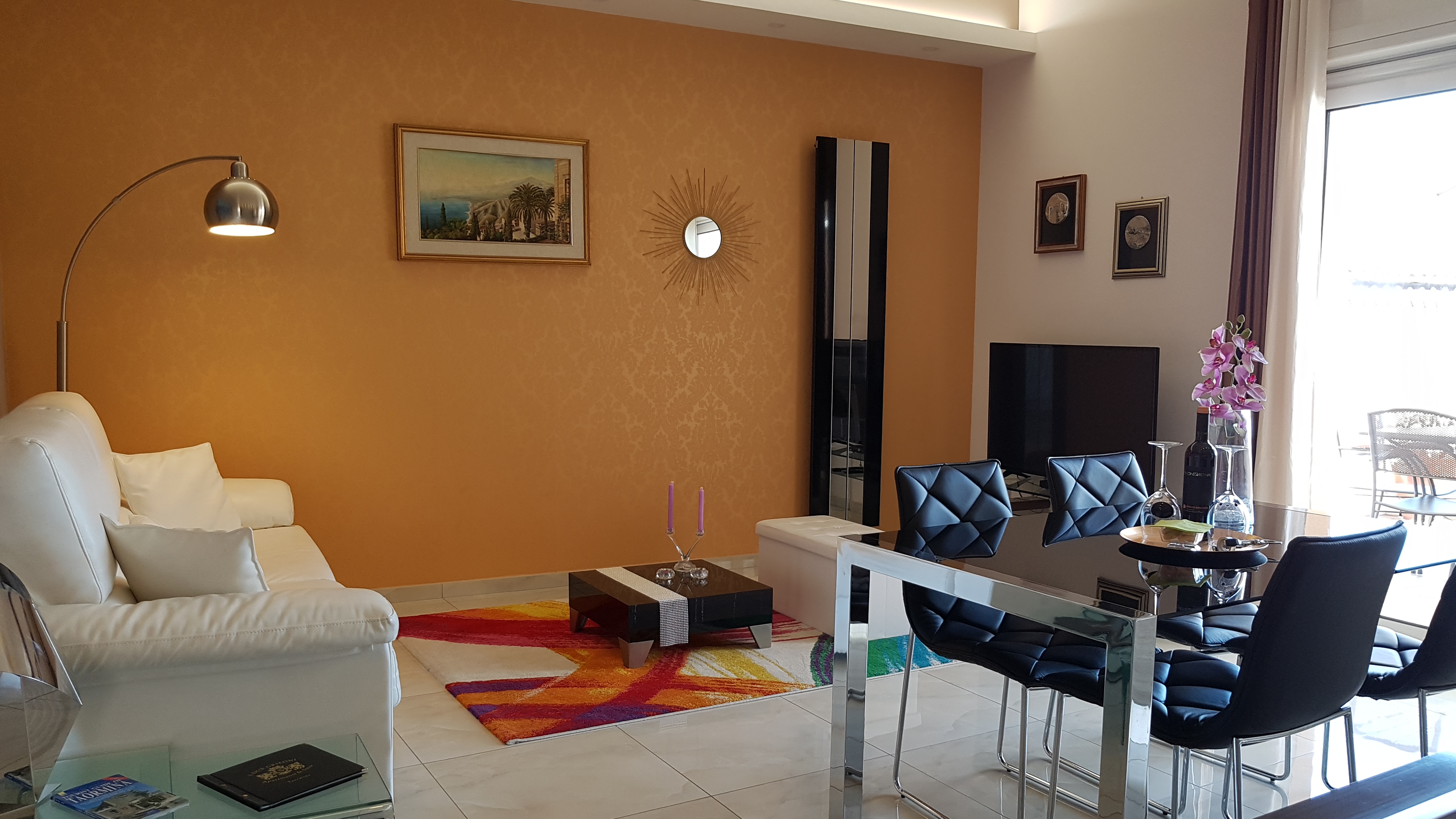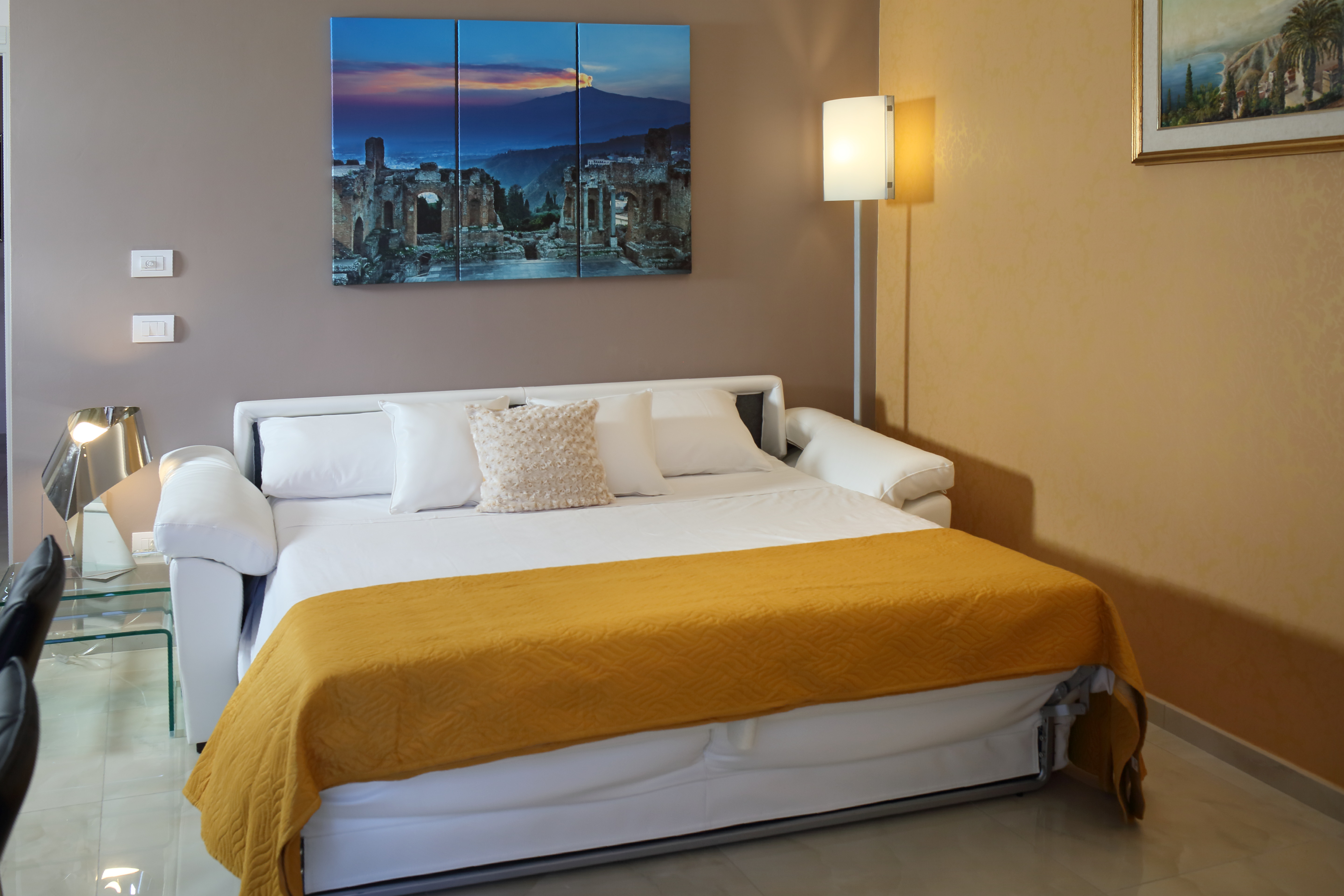 L'appartamento, situato al 2º piano di un edificio nel centro storico di Taormina (a pochi passi da Porta Messina), è nuovo e dispone di una camera matrimoniale, un bagno con doccia, una cucina-soggiorno (con divano letto matrimoniale) e una terrazza sul tetto.